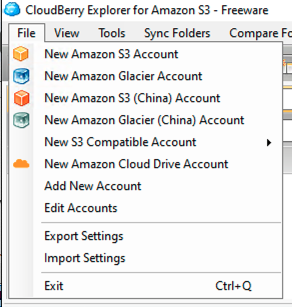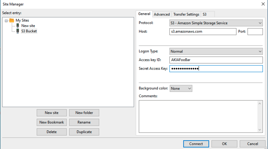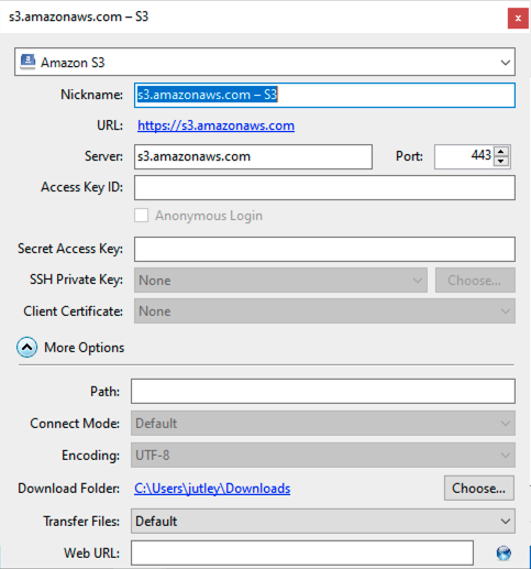 From the Site Manager Window, select an entry in the left hand window that references S3 storage.