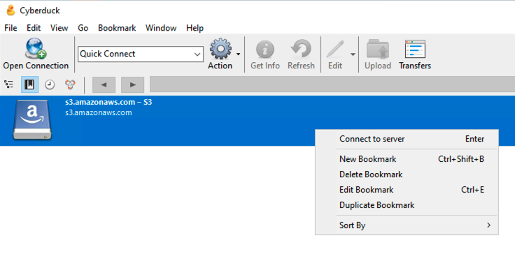 In the Bookmarks screen, right click on a bookmark for an S3 connection, and select “Edit Bookmark”: